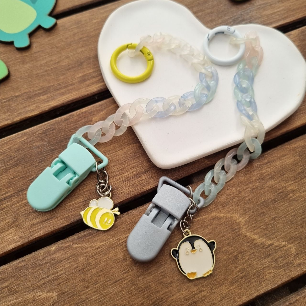 دخترانه با گیره سرخابی و خرس سبز ,دخترانه با گیره سبز و خرس سرخابی ,دخترانه با گیره بنفش و خرس صورتی ,پسرانه با گیره سبز و آویز زنبور ,پسرانه با گیره طوسی و آویز پنگوین |
