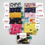 یک)گل پنج پر/ زمینه مشکی ,دو)گل رز/ زمینه سرمه ای ,سه)قلب ریز/ زمینه خردلی ,چهار)دسته گل رز/ زمینه مشکی خالدار ,پنج)حرگوشی/ زمینه سرخابی ,شش)گل آبرنگی/ زمینه آبی ,هفت)گل رز/ زمینه سرمه ای خالدار ,هشت)گل رز/ زمینه صورتی خالدار ,نه)ماشینی/ زمینه سفید ,ده)گل رز/ زمینه زرد ,یازده)تکاوری |